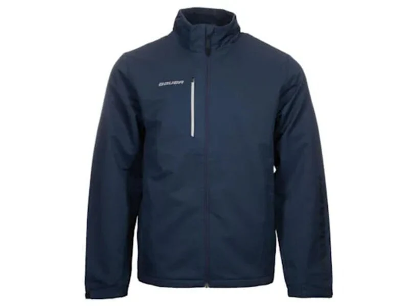 The jacket features high-quality YKK® zippers, convenient on-seam pockets, and a right chest pocket for secure storage. Adjustable sleeve cuffs allow for a personalized fit, while the fleece lining adds extra warmth without bulk. The BAUER logo is screen-printed on the left sleeve, right chest, and back neck for a clean, professional finish.